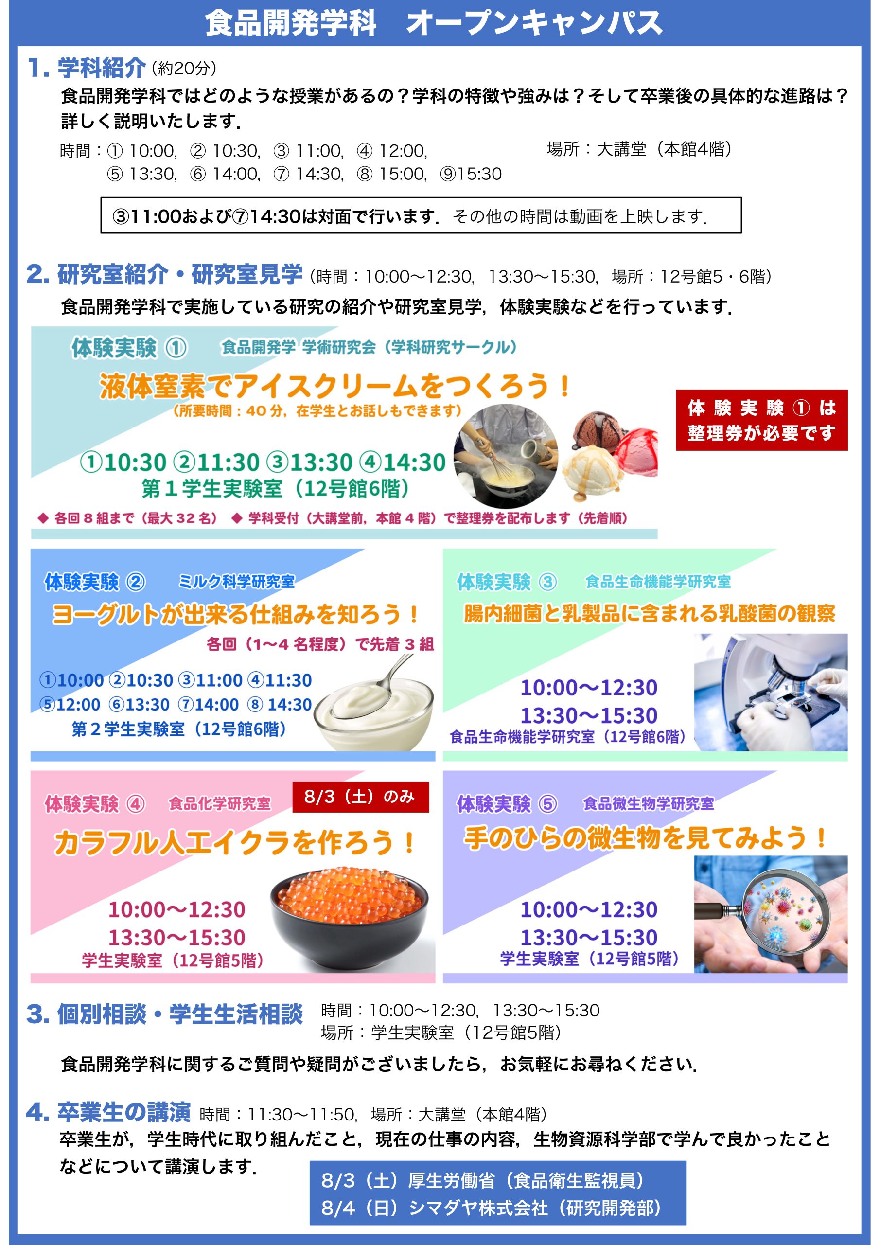 学科紹介では、食品開発学科がどのような学びを提供し、どのような特徴を持っているのかを深く理解していただけます。また、研究室紹介・見学や体験実験を通じて、最新の研究に触れられ、学びの魅力を体感できます。