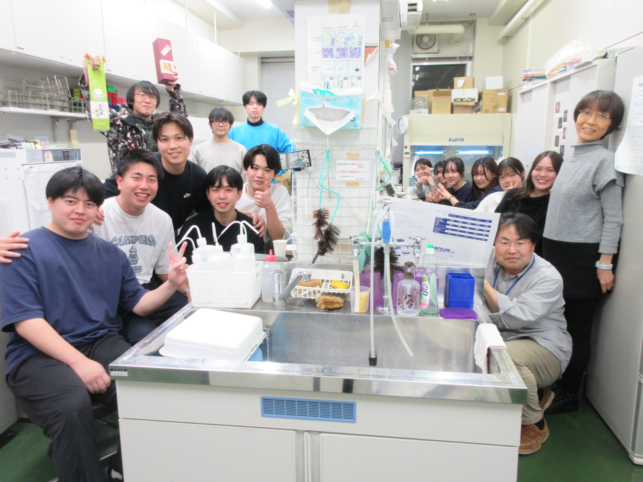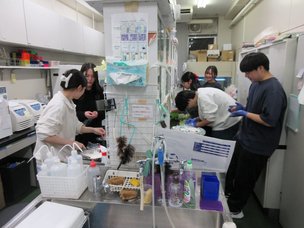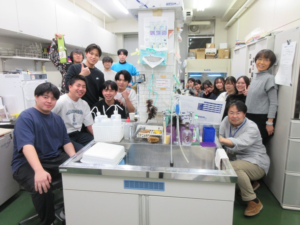 2025年度大掃除&忘年会 X Facebook コピー 2025.12.262025.12.27 2025年12月19日(金)に恒例の研究室大掃除をした後、忘年会を行いました。複数のトラブルにもめげず、よく頑張りました。沢山学んで(よく)遊んで、本当に充実した一年でした。とても感謝しています!本年最後に一つ残る卒論要旨を仕上げて(残実験のある人は気を付けて)、良い年末年始を迎えましょう。 廊下も綺麗に!? センスあるなぁ・・・ はなまる!あげます。 はい、それで、陸の孤島に さあ、忘年会に! みんな、すごいなぁ、沢山の手造り・・・ みなさん、ありがとう、良いお年を!