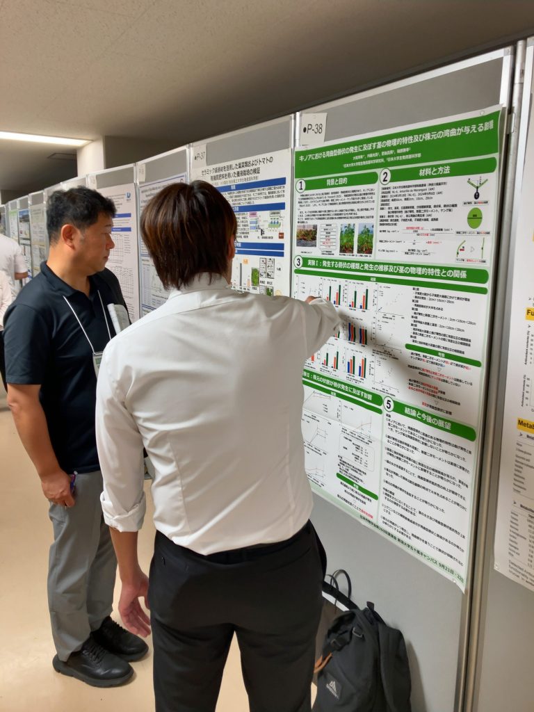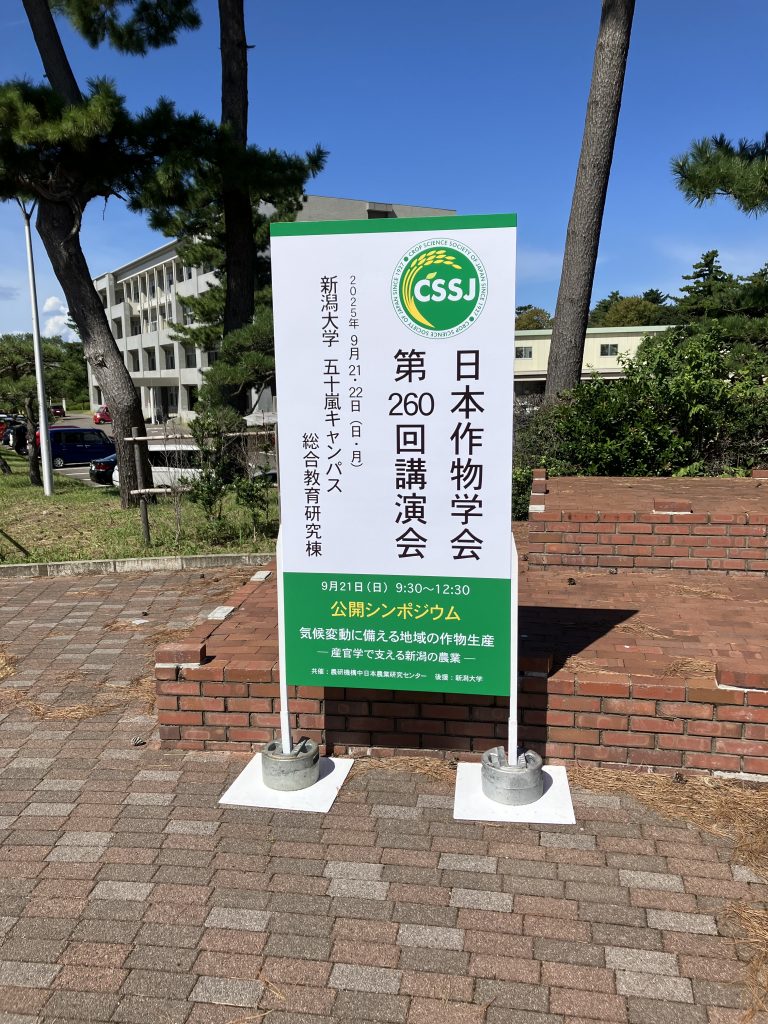第260回日本作物学会講演会は、2025年9月21日から22日まで、新潟大学五十嵐キャンパスにて開催されました。磯部教授と肥後准教授の指導のもと、大学院修士課程1年次の学生がポスター発表を行いました。学会には、日本各地の作物学研究者が参加し、活発な議論や交流が行われました。ポスター発表に対しては、他大学や研究機関の研究者から多岐にわたる質疑応答が寄せられ、非常に盛り上がりを見せました。今後も積極的に学会に参加し、他大学の大学院生や研究者の方々と交流を深めていけると良いですね!