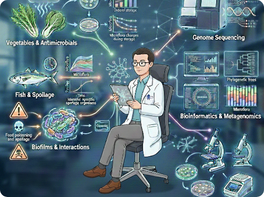 私たちが普段食べている魚や野菜がなぜ腐ってしまうのか、どうすれば食中毒を防げるのか。その答えを探るため、微生物の「設計図」であるDNAを読み解き、原因となる菌の正体を徹底的に調査しています。例えば、スーパーに並ぶマアジや水菜などの細菌バランスの変化を調べたり、菌が協力して作るベタベタした膜(バイオフィルム)の中で何が起きているのかを分析したりしています。さらに、植物が持つ天然の成分を使って、菌の増殖を抑えるといった新しい保存技術の開発も進めています。目に見えないミクロの世界を最新のIT技術で解き明かし、食の安全を守りましょう。