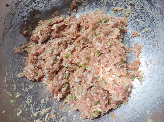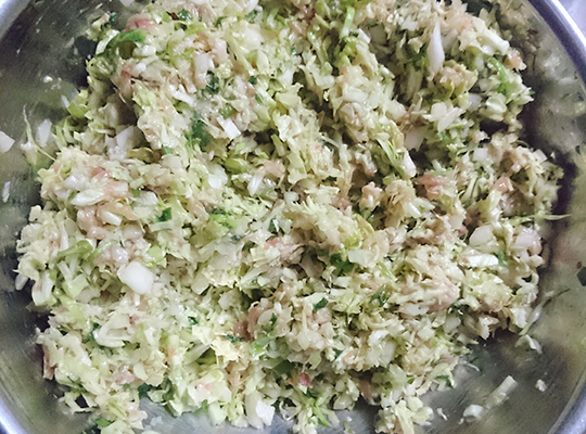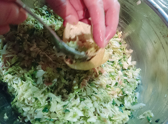 4しょうがチューブとねぎをいれて,さらに混ぜ,ハクサイとニラ,かたくり粉を加え混ぜます。