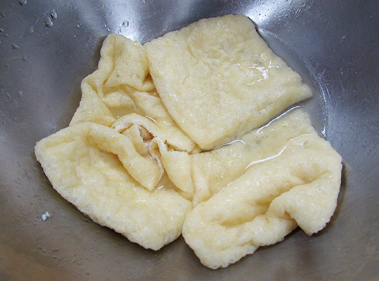5油揚げをお湯に通し油抜きをして,水分を絞ります。