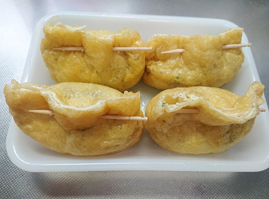 6油揚げを半分に切って,袋の中を広げ,④をスプーンで入れます。