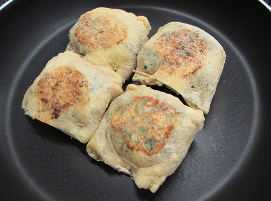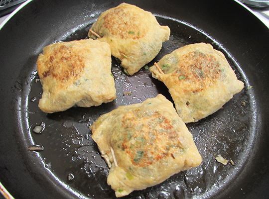 8フライパンに巾着を敷き両面焦げ目がつくまで中火で焼きます。