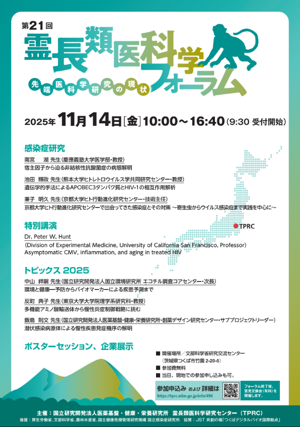 令和7年11月14日(金)に共同研究機関である国立研究開発法人 医薬基盤・健康・栄養研究所 霊長類医科学研究センターが主催の「霊長類医科学研究フォーラム」が開催されます。