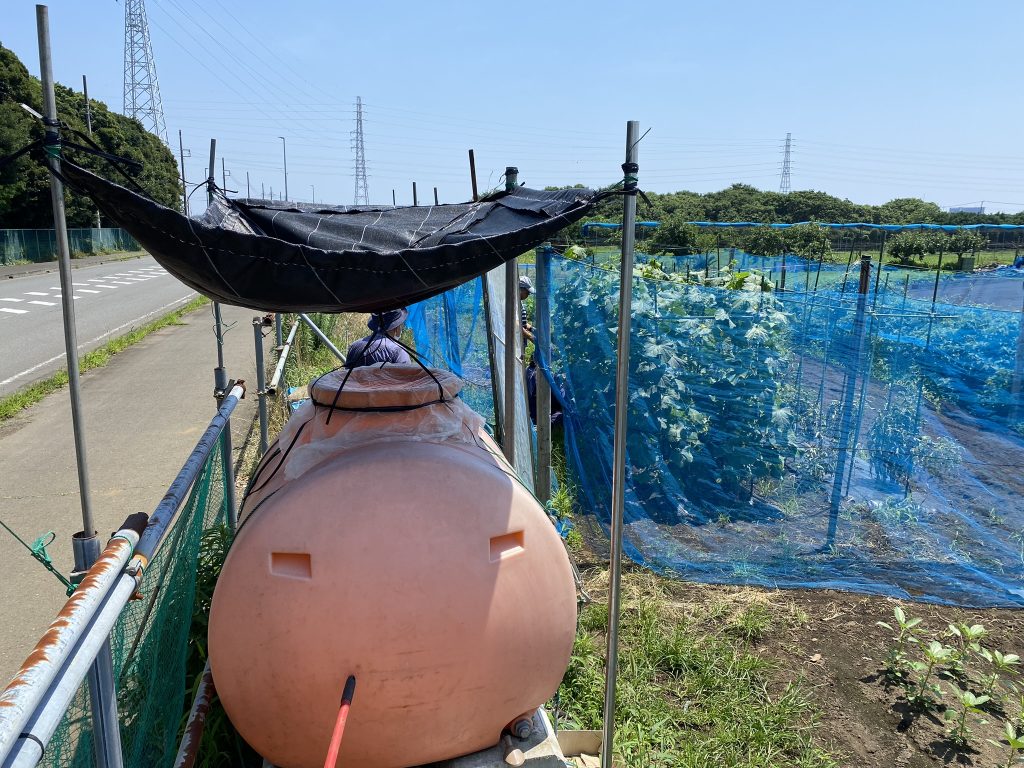 17号地の畑は、キャンパス最南端の「善行-六会道路」の西側にあります。道路沿いの細長い底辺の短い三角形状で面積は約100坪ほどです。周囲には水の供給施設がないので不便を強いられています。これまでは、リヤカーで水を運搬したり、会員のご好意により軽トラックにより貯水タンクへ水を運搬してもらうなどして対応していました。今回、小林会員が降雨を集水する装置を作製しました。降雨をタンクへ貯水する方法はいくつかありますが、場所が道路沿いの歩道脇でもあり、先ず安全性を第一にしなければなりません。制約条件の中で、考案されたのが、写真に示すように、タンクの上部に不透水性の布を使用し、下の貯水タンクへ降雨を流し込む方式です。布を支えるのは4本の鉄パイプです。これなら万が一の時でも、布が壊れる程度で、被害は最小限に収まります。集水布の面積は約2㎡のロート状で、集水は直接貯水タンクへ導入される方式です。タンクの蒸発を押さえるためと異物の混入防止用のビニールの覆いが繊細な作りになっています。藤沢市周辺の年間降水量は約1529ミリです。2㎡の集水布の面積への降雨量は年間貯水量は約3トンになります。このうち30%程度がこぼれたりする率、加えて蒸発率を10%とすれば1.529mm×2㎡×0.7×0.9=1.93㎥(トン)の水を利用できることになります。降雨の降り始めからの雨量が100ミリに達しますと、2㎡×0.1m=0.2㎥、即ち200リットル×0.63=126リットルを貯水できる計算になります。藤沢周辺は7月8月の2か月で約280ミリ雨が降ります。2㎡×0.28m×0.63=0.35㎥。夏の2か月で350リットルを貯水する計算になります。この装置の機能の発揮により、育苗や栽培時の水の心配がなくなり、重労働からも解放されることが期待されます。