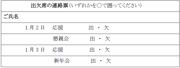 へお知らせください。ご回答はFaxをご利用の方は末尾の連絡票にて、それ以外の場合には下記のフォームにて12月20日(金)までにお願い致します。https://docs.google.com/forms/d/e/1FAIpQLSdXaNR0Dxcj24EMmwAnlUP-vEg7c2c4wSf7LHRpD6ECCTTfAg/viewform