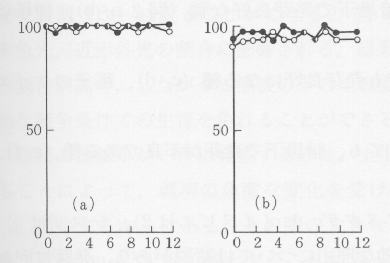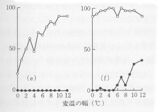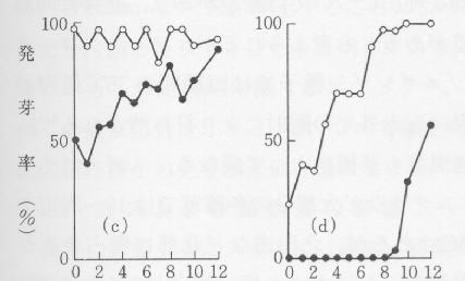 f:オオアカバナ○-○は明区(光照射18hrs),●-●は暗区,高温(22度),低温をこれより0-12度低くし暗期の6時間を低温とした場合の光と変温が発芽に及ぼす影響。