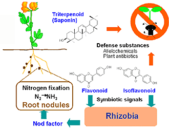 | 図1.マメ科植物の化学因子と環境生物の相互作用.フラボノイドやイソフラボノイドが根粒細菌に化学シグナルとして働きかけ,生じたNod因子がマメ科植物に根粒をつくらせるように働きかける.根粒中では窒素固定が行われ,窒素栄養が産み出される.一方,植物のトリテルペノイドやイソフラボノイドは植物がテリトリーを確保したり病原微生物から身を守るのにも働いている. |  |  |
