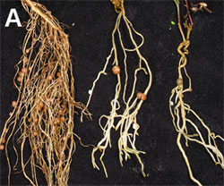 A:根粒細菌との共生変異体候補,左から野生型,根粒数の減少,無効根粒着生