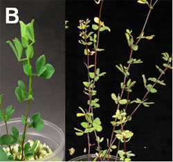 1.マメ科モデル植物ミヤコグサのアクティベーションタギングラインの確立と共生関連遺伝子の単離:ミヤコグサは2倍体のマメ科雑草で,ゲノムサイズが小さく実験室内で簡単に栽培できるので,マメ科のモデル植物として広く利用されており,ゲノム解読も進んでいる.私たちはミヤコグサの効率的な形質転換法を開発し,ゲノム中にエンハンサーのタグ(目印・荷札)を付けた.これによってミヤコグサは機能獲得型の変異を起こし,その原遺伝子の同定が可能になる.これまでに約3000のタギングラインを作製し,バイオリソースとして広く研究者の役に立てる準備も始めている.また窒素栄養飢餓症状を示したり根粒細菌との共生に異常の見られる株が得られ,その変異の原遺伝子の解明を進めている(図2).