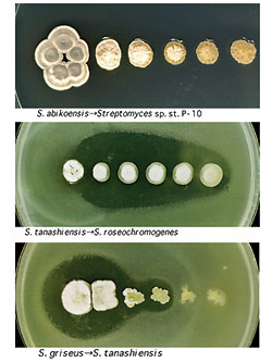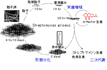 griseusでは、A-ファクターと呼ばれるg-ラクトン化合物がその特異的レセプター蛋白質を介して作用し、形態分化と抗生物質生産の開始を誘導することが知られている。同族の自己調節物質による分化と二次代謝の誘導制御は、現在では様々な放線菌において見いだされている。