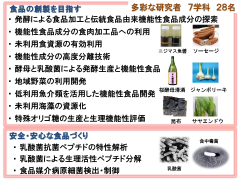 現在、研究室や学科の枠を越えて30名近い学内の食品研究者が結集し、各自が保有する各種技術やシーズを用いて、総合的に食品加工や製造技術、未利用資源の有効利用や新規資源の発掘、さらに食の安全性や機能性に関する研究を展開しています。また、産学連携や食品産業で活躍する人材の育成を目指して、公開シンポジウムや技術講習会など、教育や社会貢献も含めた活動を展開しています。