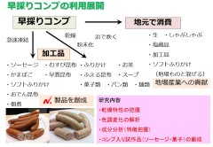 「早採りコンブ」はワカメに似ていますがコンブの風味をもち、アルギン酸などの多糖類を多く含有し、機能性食品の素材としての利用が期待されます。これまでに、「早採りコンブ」の機能成分解析、乾燥特性解析などを行い、「早採りコンブ」入りのソーセージなどの試作を行っております。