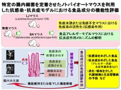当学部では免疫系や代謝系の異常がもたらすアレルギーや生活習慣病に対する食品機能性の評価に関し、多くの研究者が先端的研究を展開しています。 特徴ある取り組みとして、特定の腸内細菌叢を定着させたノトバイオート(実験動物)を用いた腸管免疫評価技術や、各種モデル動物を用いた肝障害抑制効果や高血糖改善効果の評価技術、動物細胞系を用いた動脈硬化予防作用の解析や発癌予防に関する研究などがあります。今後、こうした先端的な研究基盤を活かして地域の食品企業との連携を推進して行く計画です。