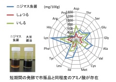 様々な前処理条件や発酵条件で創製した魚醤の特性や微生物叢などを解析し、工程を改善することにより、魚臭さが軽減され、遊離アミノ酸を豊富に含むニジマス魚醤を速醸的に製造する方法をみいだしました。既存の魚醤と比較した結果、淡色で、魚臭さがなく、濃厚な香りをもち、アレルギー様の食中毒の原因となるヒスタミンをほとんど含まない高品質の魚醤であることが確認されました。現在、量産化技術と利用技術について検討を進めています。