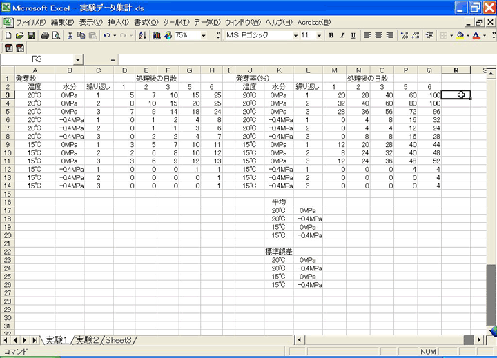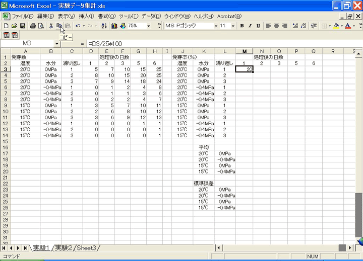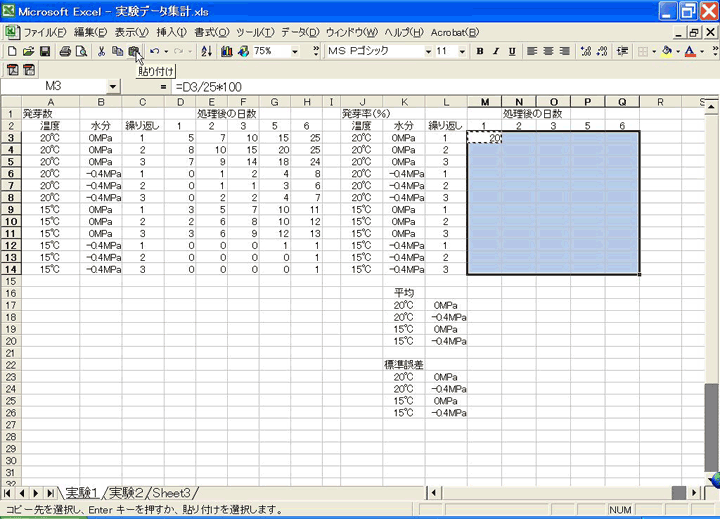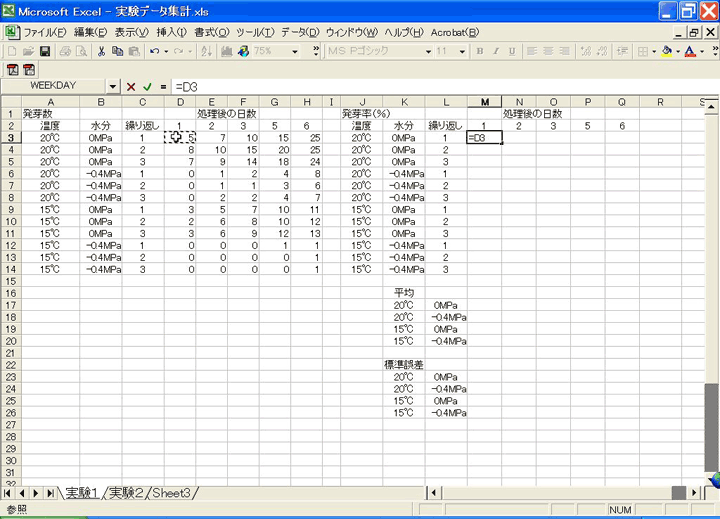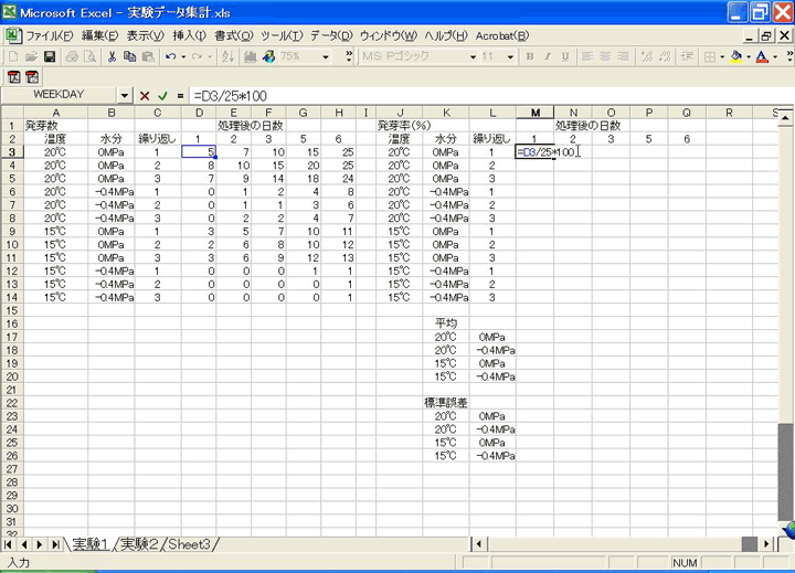 データを入力したら発芽率を計算するための数式を入力します。発芽率の計算式は「測定値/25×100」ですので、まず発芽率の計算式を入力するセル(M1)を選択し、半角で"="を入力し、続いて計算対象となるセル(D3)をマウスでクリックします。
