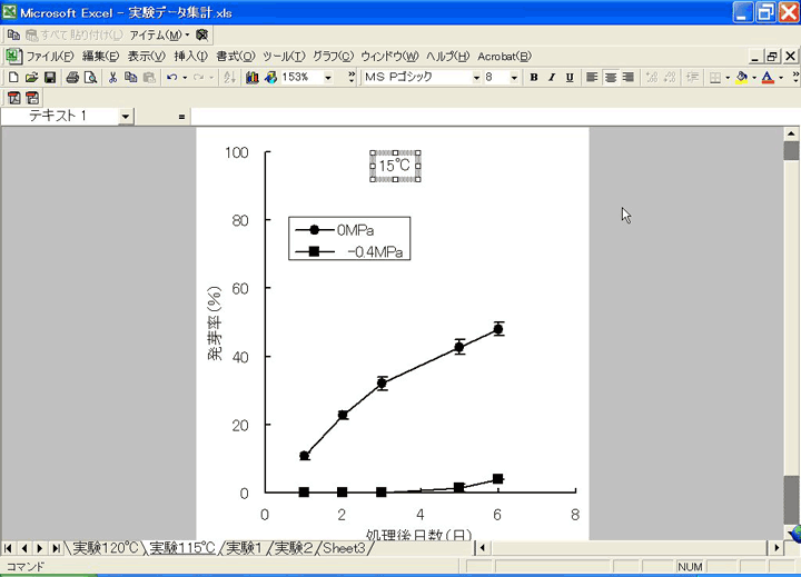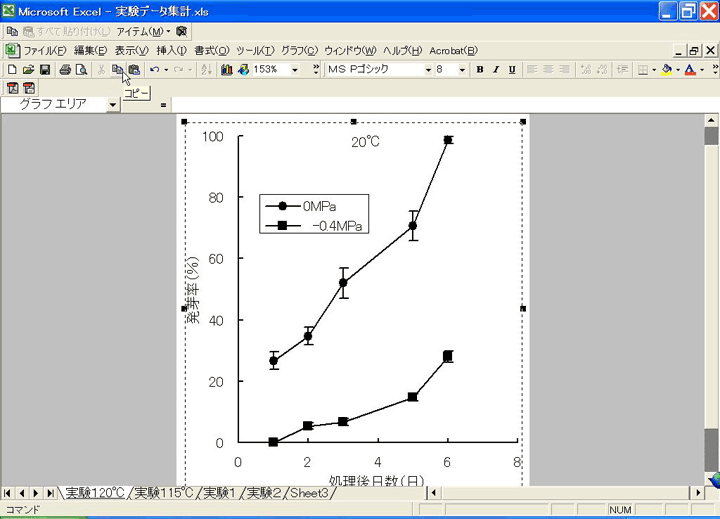 そこで、グラフ書式を一気に整える方法を紹介します。先ほどのグラフでは20℃の発芽率をグラフにしたので、次は15℃の発芽率をグラフにします。先ほどの例を参考に、平均値のグラフ、標準誤差の書き込み、グラフの大きさまでは同じ手順で作成してください。そうすると、下図のようなグラフがとりあえずできていると思います。