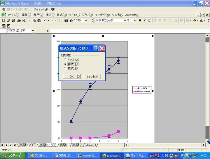 そうしたら、15℃のグラフシートを選択し、下図のように「編集」−「形式を選択して貼り付け」を選択します。