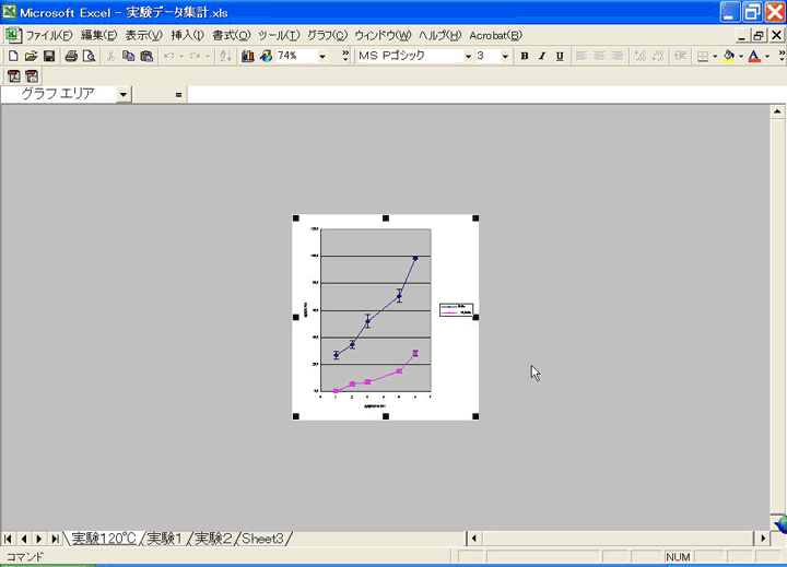 グラフの白い部分をマウスで左クリックすると、白い部分が四角の点で囲まれ、グラフエリアが選択されました。