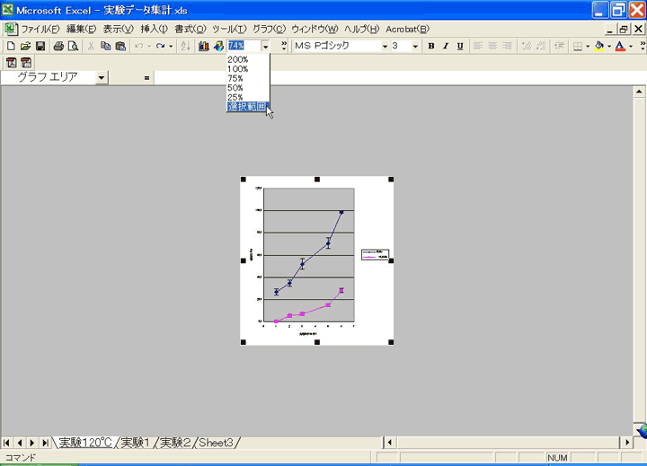 そして、ツールバーにあるパーセント表示の数字のリストボックスをクリックして、「選択範囲」を選択してください。