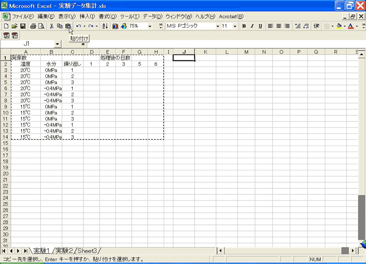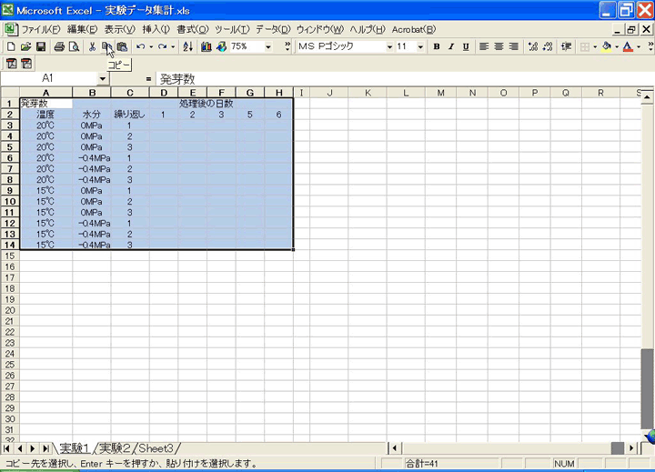 続いて、入力したデータ(発芽数)から発芽率を計算させるための枠を作ります。処理区名などは先ほど作ったデータ入力の枠とまったく同じなので、それをコピーします。コピーをする範囲を指定するには、マウスカーソルをコピーしたい範囲の一番左上に持っていき、そこでマウスの左ボタンを押したままコピー範囲の一番右下に持っていって、ボタンを離します。すると、下図のように範囲が選択されます。そこで、コピーボタンを押します。