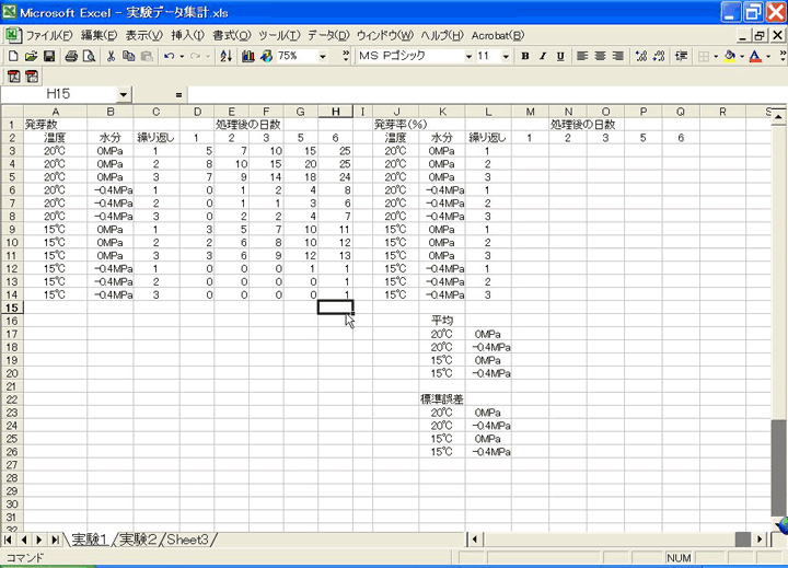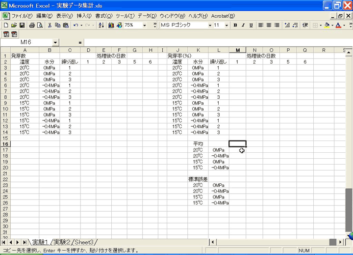この実験では発芽の平均値と標準誤差を求めるので、れを書き込む枠を以下のように作ります。