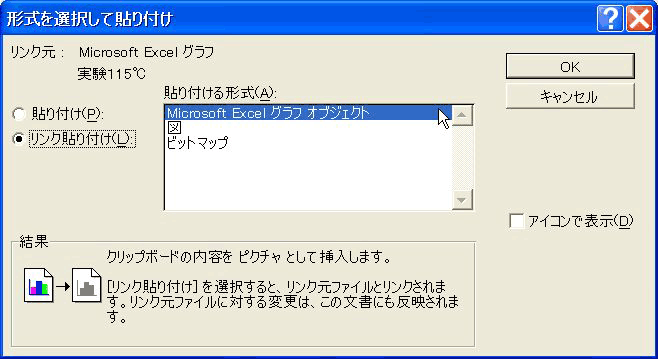 「リンク貼り付け」を選択したら、「Microsoft Excel グラフオブジェクト」を選び、OKボタンを押してください。