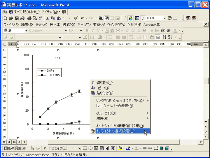 コピーされたグラフを選択したら、マウスの右ボタンをクリックし、「オブジェクトの書式設定」をクリックしてください。
