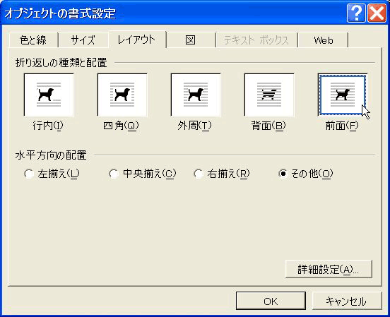 すると、「オブジェクトの書式設定」メニューが現れるので、「レイアウト」タブをクリックし、「折り返しの種類と配置」を「前面」にして、OKボタンを押してください。