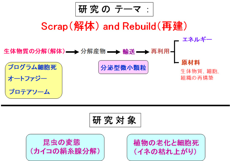 チーム司馬について【研究概要】チーム司馬では、昆虫の変態、動植物の老化・細胞死の分子機構を「生体物質の分解と再利用」の観点から解明しようと研究に取り組んでいます。将来は、研究成果を分子育種や医学の分野に応用し、病気や過酷な環境に強い動植物の開発、病気の予防や治療などに役立てたいと考えています。 【求めている学生】(1)努力を怠らず、地道に卒業研究に取組むことができる学生。(2)自分が何をすべきなのかを自主的に考え、行動に移すことが出来る学生。(3)有言実行で、約束が守れる学生。(4)コミュニケーション能力と協調性を有する学生。(5)ユーモアがあって、意外性と創造性がある学生。(6)学術的な見方と考え方を身に着けたい学生。(7)生化学・分子生物学的な実験を通じて生命科学の面白さと奥深さに触れてみたい学生。 【入室後の義務付け】(1)研究室に来て、自主的に勉学し、研究実験を行うこと。(2)研究室ゼミに2/3以上出席し、討論に参加すること。(3)年3回程度英語の論文を読み、研究室ゼミで紹介すること。(4)自分が行っている研究実験の進展を報告すること。(5)中間発表(2回)と卒論研究発表を行うこと。(6)鍵開けと掃除を当番制で行うこと。(7)研究室を常に清潔に保つこと。 【卒業後の進路】就職や大学院進学に関する相談はしますが、就職活動や大学院進学のための勉強は学生自身が自主的に行う。