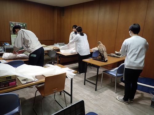茅ヶ崎市博物館の学芸員さんと日大の博物館実習生による梱包作業の様子