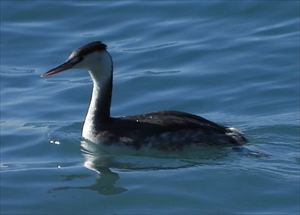 三浦半島西岸、相模湾に面した長者ヶ崎付近の海上には、日中いつもカンムリカイツブリが集まって休んでいます。ここではどの個体も、羽繕いなどをしながらのんびりと過ごしています。