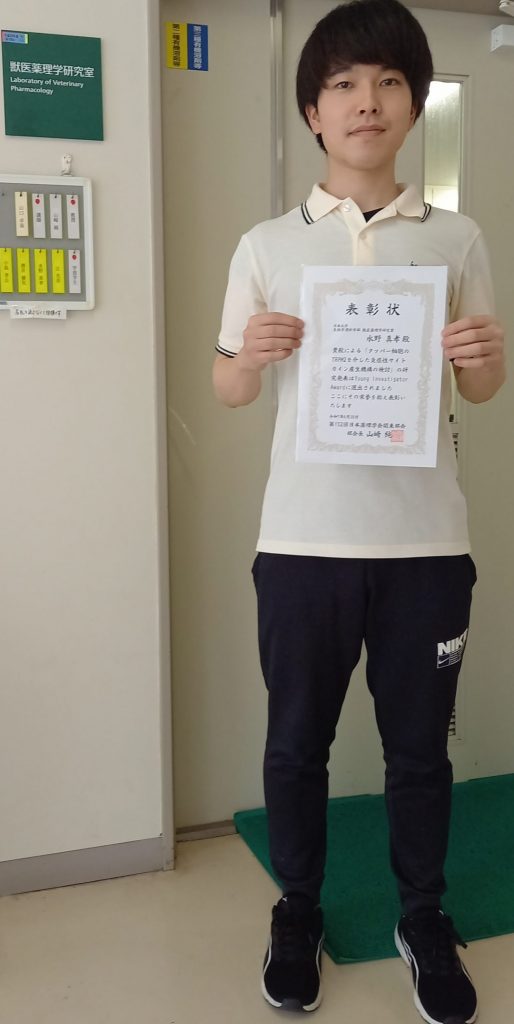 令和7年6月28日に開催された第 152 回日本薬理学会関東部会において、当研究室の水野真孝君(獣医学科6年)が口頭発表(演題名「クッパー細胞の TRPM2 を介した炎症性サイトカイン産生機構の検討」)を行い、学生優秀発表賞である Young Investigator Award を受賞しました。おめでとうございます!