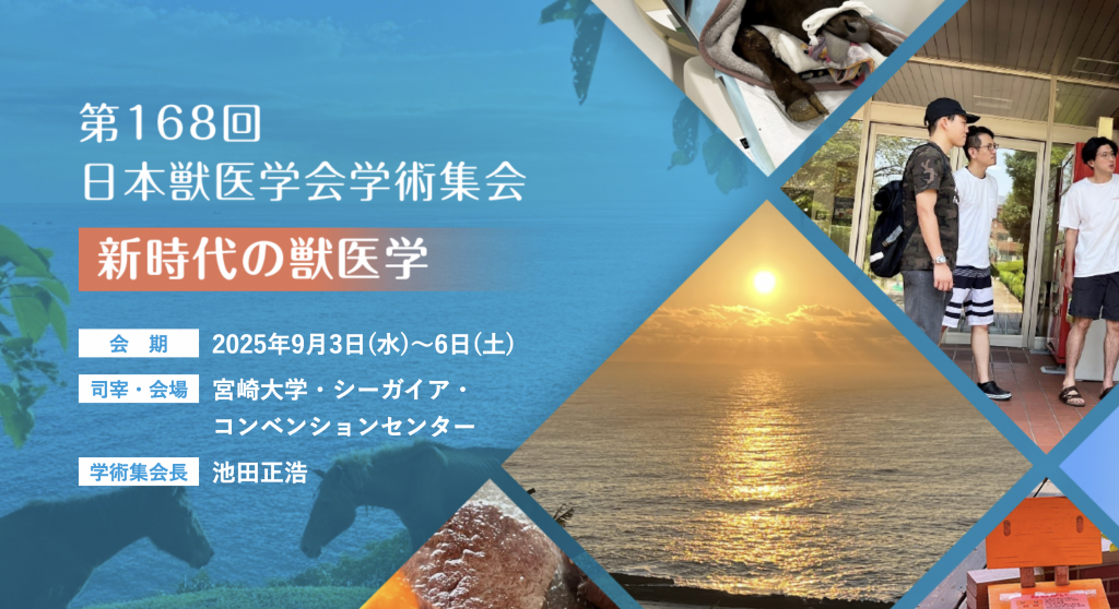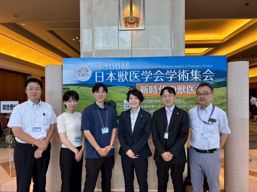 2025年9月3日(水)から5日(金)にかけて宮崎県のシーガイアコンベンションセンターにて開催された「第168回日本獣医学会学術集会」にて、当研究室の学部生4名が下記の研究内容について口頭発表をしました。